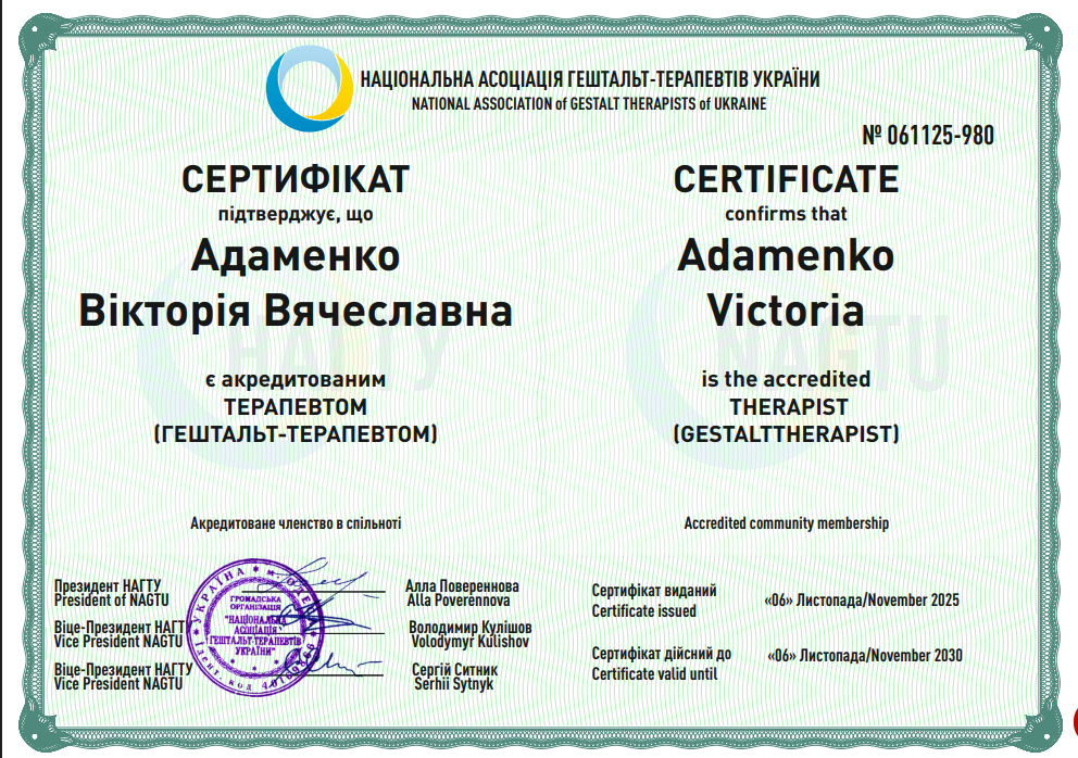 Усі спеціальності:Арт-терапевт, Гештальт-психолог, Гештальт-терапевт, Психолог для пари, Символдрама-психотерапевт, Сімейний психолог, Травматерапевт, Фахівець з системних розстановок