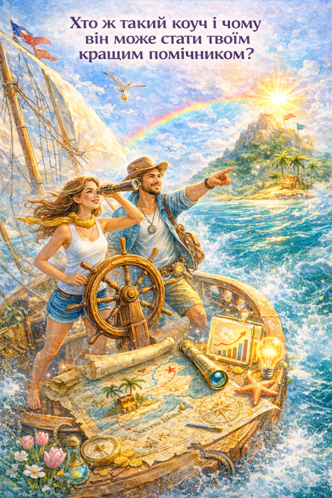 самому – довше. Коуч – це не “чарівна таблетка”. Це скорочення шляху. Менше зайвих кіл. Менше помилок “наосліп”. Більше ясності і точності. І як наслідок – швидший результат. Це не просто навчальна партія, це пригода на берегах величезного океану можливостей. Коуч – твій вірний помічник, що робить твоє життя захоплюючим. Коуч – це твій секретний код до успіху. І головне Коуч – не твій герой. Ти – герой. Він допомагає тобі це згадати. Він не створює в тобі силу. Він допомагає її побачити і використати. І тоді життя перестає бути боротьбою. Воно стає рухом.